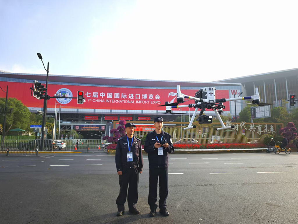 青浦公安分局民警在国家会展中心周边运用警用无人机开展日常巡航。
