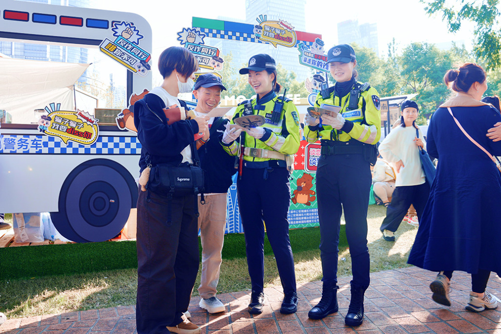 浦东分局明珠中队女警在上海咖啡节陆家嘴中心绿地开展交通安全宣传。