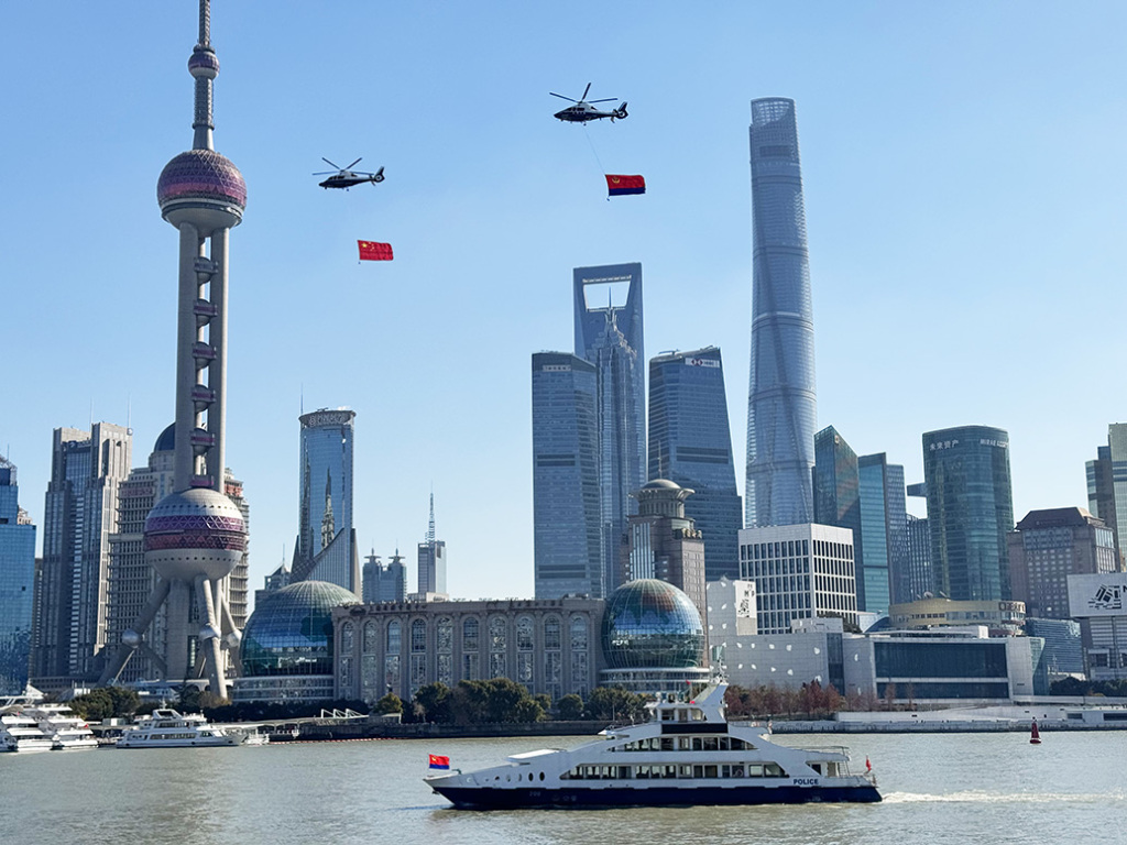 上午11时许,两架悬吊着巨幅国旗和警旗的警务直升机飞越黄浦江,引来江畔游人们驻足观摩。随着一阵阵汽笛声响起,悬挂着警旗的公安巡逻艇闪烁着警灯,缓缓驶过堤岸,在江面拉出了一道道洁白的浪花。