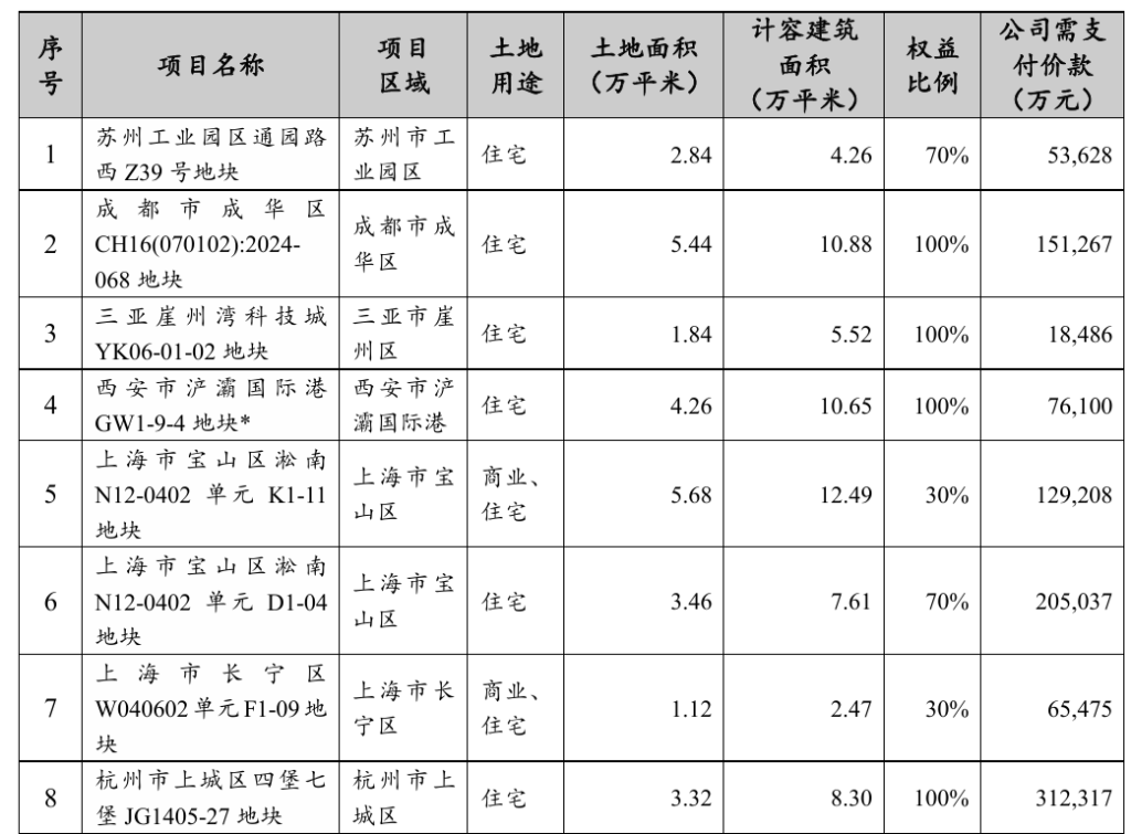 其中,苏州市工业园区通园路西Z39号地块权益比例为70%,需支付价款5.36亿元;成都市成华区CH16(070102):2024068地块权益比例为100%,需支付价款15.13亿元;三亚崖州湾科技城YK06-01-02地块权益比例为100%,需支付价款1.85亿元;西安市浐灞国际港GW1-9-4地块权益比例为100%,需支付价款7.61亿元;上海市宝山区淞南N12-0402单元K1-11地块权益比例为30%,需支付价款12.92亿元;上海市宝山区淞南N12-0402单元D1-04地块权益比例为70%,需支付价款20.5亿元;上海市长宁区W040602单元F1-09地块权益比例为30%,需支付价款6.55亿元;杭州市上城区四堡七堡JG1405-27地块权益比例为100%,需支付价款31.23亿元。