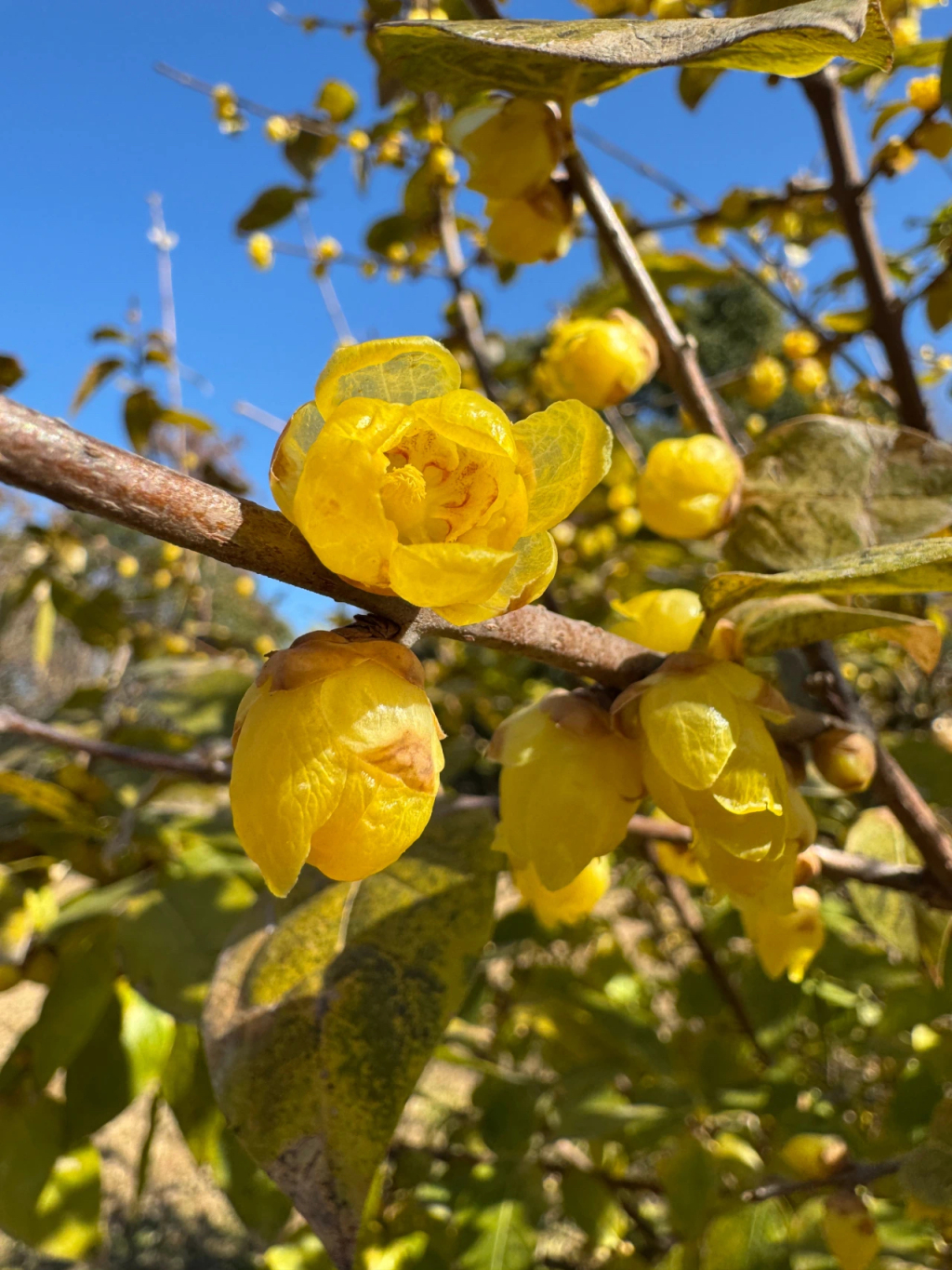 共青森林公园的蜡梅以素心蜡梅为主,其以独特的花香而闻名,内部花被片均为黄色或淡黄色,开花时花瓣反卷,香味浓郁。