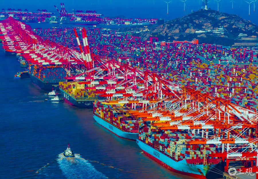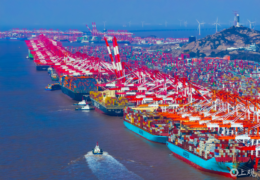 上海洋山港码头泊位全部靠满作业。