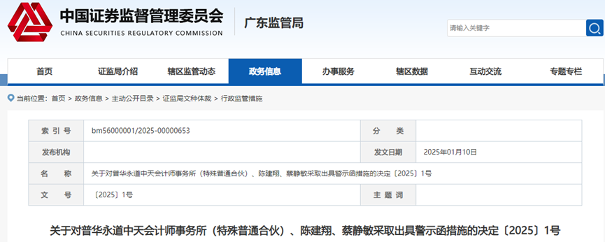 根据《上市公司信息披露管理办法》第五十五条的规定,广东证监局决定对普华永道、陈建翔、蔡静敏采取出具警示函的行政监管措施。