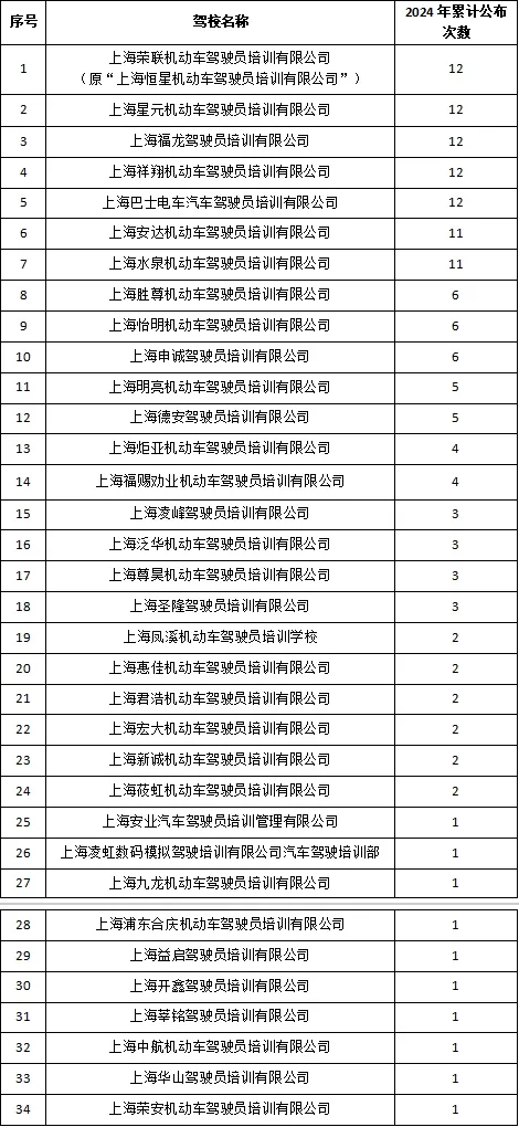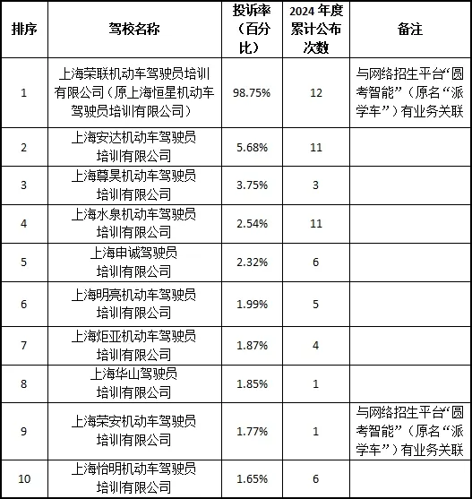 (原标题为《本市2024年12月及全年驾校投诉率排序公布》)