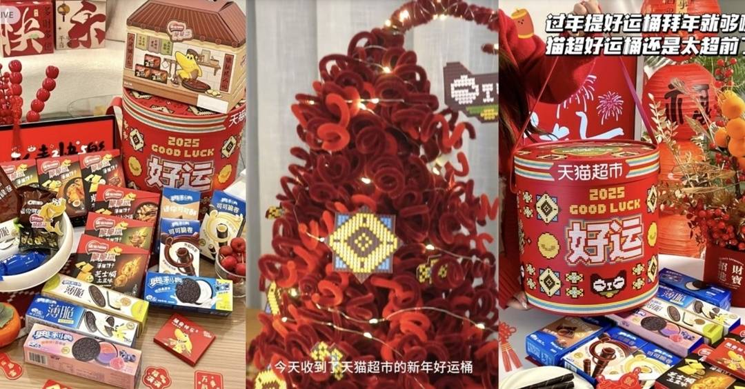 除了二次元联名礼盒,一系列“好运”礼盒同样受到00后的追捧。“不管东西怎么样,情绪价值先拉满”是当下年轻人消费的一大趋势。天猫超市数据显示,良品铺子抱一桶金巨型零食大礼包、奥利奥年年有余灯笼礼盒、德芙发财大金塔好运礼盒在年货节开卖后,销量相比年货节前增长了10倍,消费者在平台搜索“礼盒”超过100万次。