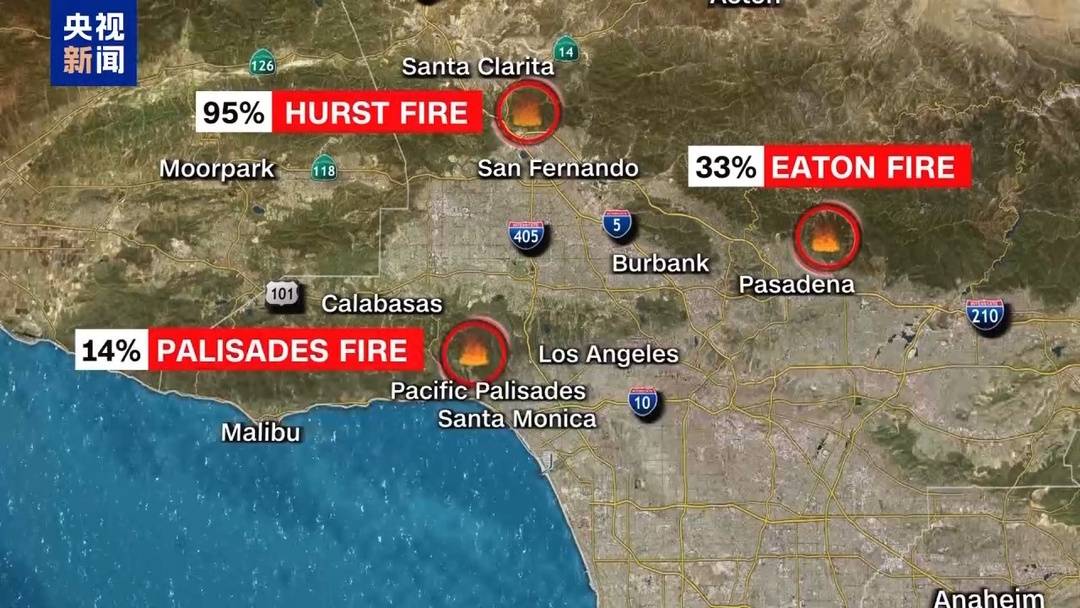 在加州南部的几起主要山火中,规模较小的赫斯特山火有95%得到控制,目前过火面积约3.2平方公里。规模第二大的伊顿山火相比于一天前,过火面积没有变化,同样还是57平方公里,已有33%得到控制。而规模最大的帕利塞德山火过火面积相比于一天前也没有变化,约为96平方公里,目前帕利塞德山火有14%得到控制。