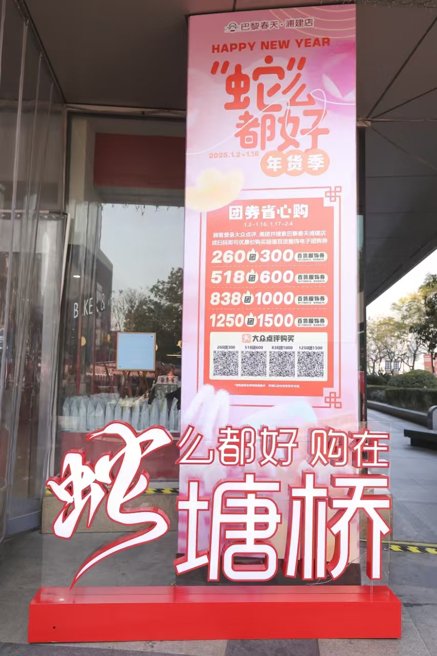 其中,“1”为巴黎春天的“蛇么都好,购在塘桥”大型购物促销,联合各大品牌推出专属折扣、满减优惠、赠品等活动。“N”则包含七大板块:南泉生活广场“逛在塘桥”传统市集,打造具有传统年味的市集氛围,设置各类特色摊位,售卖传统年货;塘桥美好生活馆与多家餐厅“吃在塘桥”年夜饭优惠套餐,联合推出丰富多样的年夜饭套餐选择,涵盖本帮菜、川菜、粤菜等不同菜系;酒店“住在塘桥”住宿特惠,结合“上海浦东旅游消费券”推出住宿优惠套餐;京东、苏宁“省在塘桥”家电福利,开展家电年货大促销活动,推出家电产品的限时折扣、以旧换新、满额返券等优惠政策;由由农业“惠在塘桥”农产品配送,装饰具有节日特色的小火车,开进街道的园区及居委,为社区居民提供由由特色的农产品;双季花市“美在塘桥”花卉展销,展销各类花卉绿植,包括年宵花以及适合室内外种植的绿植盆栽;塘桥公园“乐在塘桥”文艺汇演与非遗民俗活动,为居民带来一场视听盛宴,营造欢乐的节日氛围。