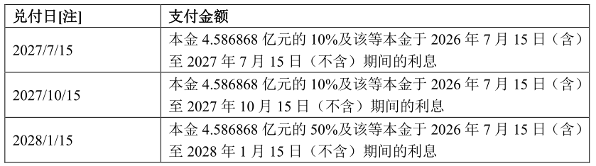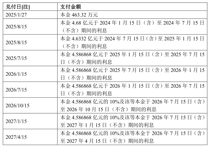 最新通过的兑付安排还显示,发行人将于1月27日兑付本期债券全部剩余本金的1%(即463.32万元)。2025年1月27日支付的463.32万元本金自2024年1月15日(含)至2025年1月15日(不含)期间的利息将于2025年8月15日一起支付,原展期方案约定的2025年7月15日(含)之后的兑付日支付金额将不含2025年1月27日已支付的463.32万元本金。