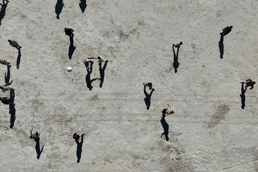 1月14日,在措昂村活动板房旁边,安置点的孩子们正在进行一场足球比赛。