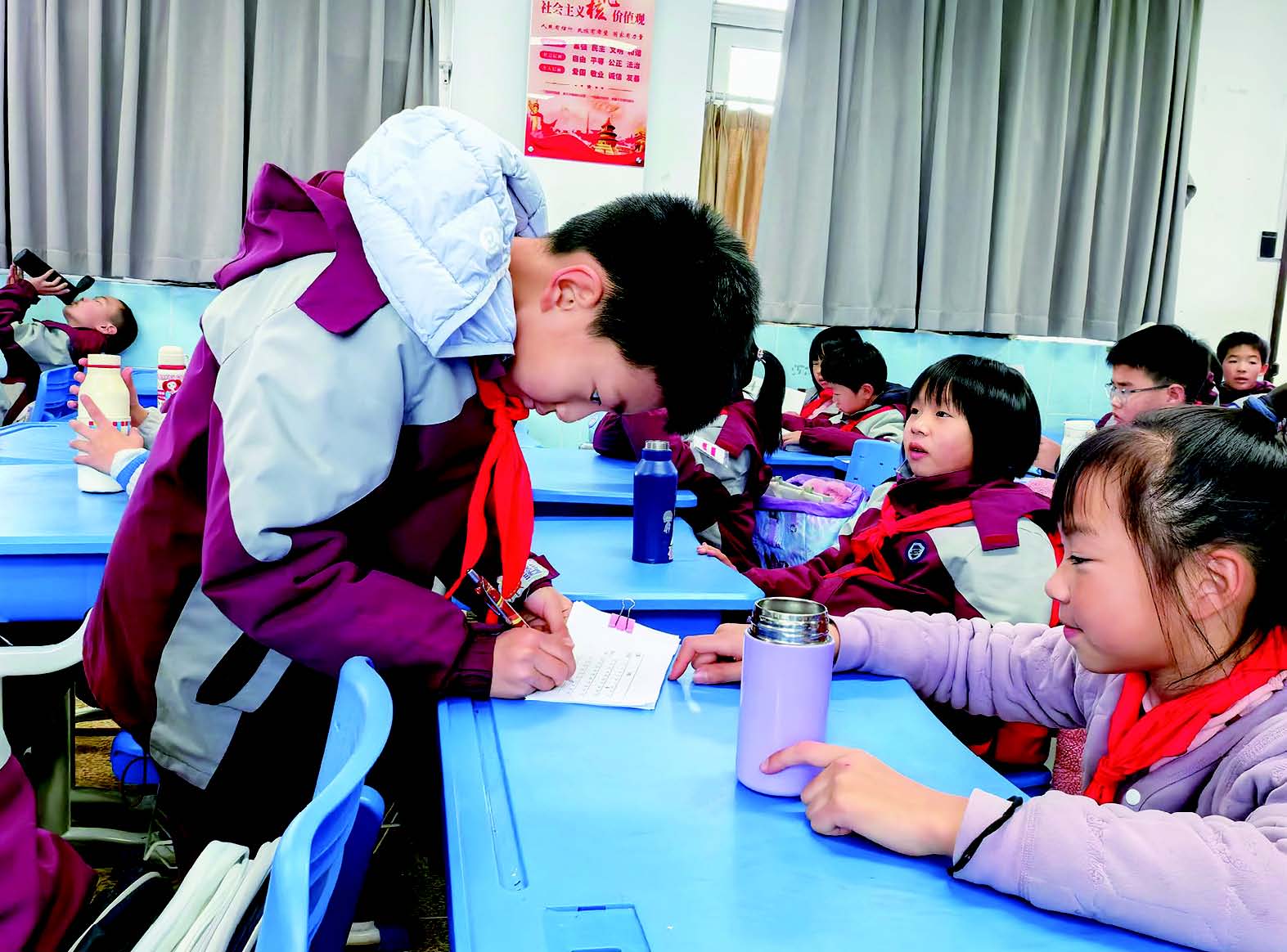 “这么暖的宝儿,请给我来一打……”去年12月25日下午,三新学校思贤分校四(2)班班主任曹欢勤公开喊话,表扬班里的喝水统计员沈湶。而像沈湶这样负责统计班级同学喝水情况的“暖宝儿”共4名,都是小队长。