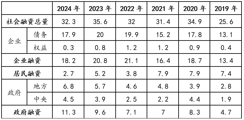 2024年社会融资总量为32.3万亿,较2023年下降了3.3万亿,其中企业18.2万亿、占比56%,居民是2.7万亿,占比8%,政府11.3万亿(地方6.8万亿,中央4.5万亿)、占比36%,与2023年相比,政府债务融资占社融的比重大幅提高了近10个百分点。