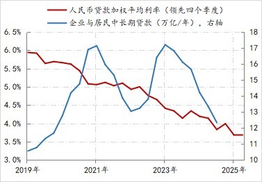 但2023年三季度之后,实体部门的利率弹性开始减弱,虽然平均贷款利率由4.4%降至3.7%,下降了70BPs,但实体部门中长期贷款年净增规模却由17.2万亿持续降至12.3万亿,下降了近5万亿。
