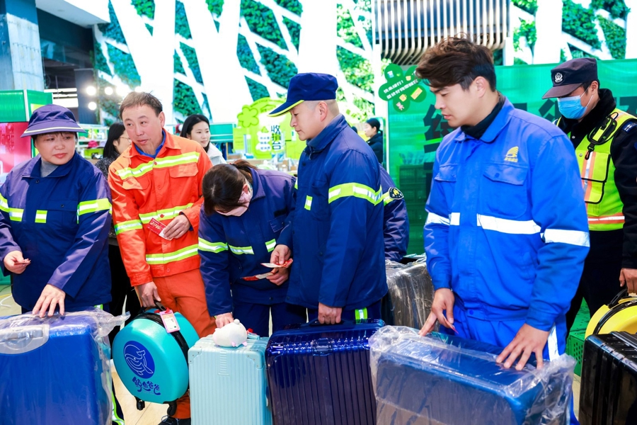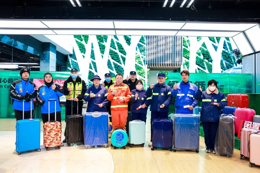 1月15日下午,在虹桥天地地下会展通道的绿行循环商店前,新虹街道正式发布“新虹·返XIANG守护计划”,向骑手小哥、环卫工人等即将返乡的新就业群体代表送上一只只经过清洗消毒的爱心行李箱。