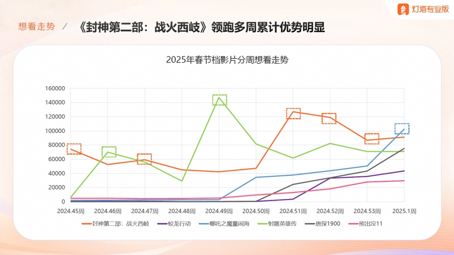 根据实时数据,2025年春节档影片映前90天至映前17天,新增“想看”超过218万,创历史同期新增“想看”新高,《封神第二部:战火西岐》《射雕英雄传·侠之大者》《哪吒之魔童闹海》位列映前想看TOP3,《封神第二部:战火西岐》和《射雕英雄传·侠之大者》更是凭借其特效水准和主演人气累计“想看”人数率先突破百万。