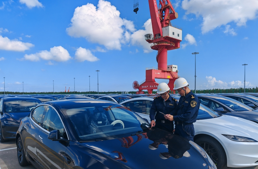 外高桥港区海关关员对出口汽车开展监管。(谢宗赢摄)