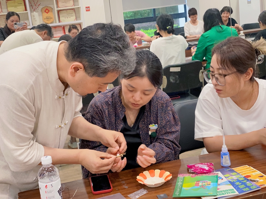 “没想到在家门口能体验到非遗首饰制作技艺,材料用的还是真玉石。”居住在宝山区高境镇的刘女士如是感叹。日前,她在家附近的党群服务中心参加了一场特色活动,跟着老师DIY手链。负责授课的是上海工艺美术大师、非遗项目首饰制作技艺(金玉镶嵌)代表性传承人郑连博。“老师很专业也很耐心,在教我们制作手链前先普及传统首饰制作技艺,据说有些已经失传,老祖宗实在是太智慧了。”一个半小时的课程体验完,刘女士带着DIY成果——“君子之交”ins风手链心满意足地回家了。