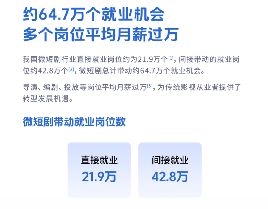 1月16日,中国网络视听协会发布《2024微短剧行业洞察报告》,报告显示,2024年各平台共上线微短剧3万多部。迅速发展的微短剧产业创造了64.71万个就业机会,涵盖剧本创作、拍摄制作、后期编辑、市场推广等多个环节,多个职位的平均月薪超过1万元,部分岗位月薪达到2万元以上。