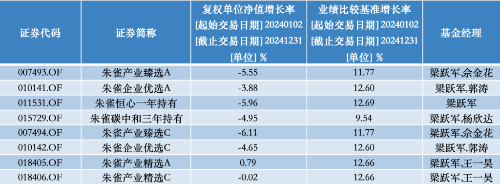 Wind数据显示,梁跃军旗下在管公募产品的规模一度在2021年6月末达到269.71亿元的峰值,但截至1月16日其管理规模已降至89.41亿元,缩水超180亿元。另从产品收益情况来看,据澎湃新闻记者统计,除朱雀产业精选A的收益率为0.79%外,梁跃军目前在管产品在2024年的业绩几乎全员告负,且均大幅跑输同期业绩比较基准。