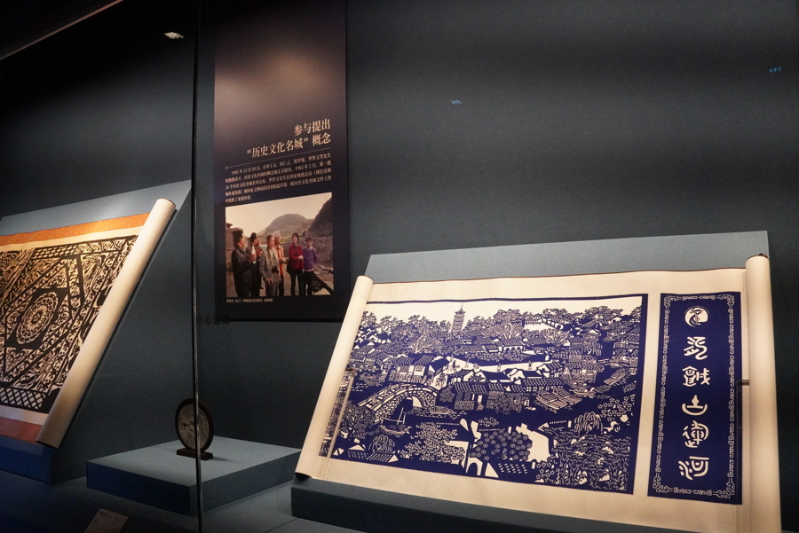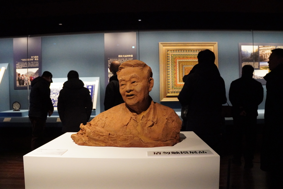 展厅里可见中国工艺美术大师朱炳仁创作的铜雕《大运河之歌》、中国工艺美术大师雷天勇采用平遥推光漆器髹饰技艺创作的《轮回——平遥古城保护神》、中国工艺美术大师史延春创作的泥塑《守望长城》、国家级非遗彩扎(秸秆扎刻)项目代表性传承人徐艳丰创作的彩扎建筑《飞云楼》等精美作品。