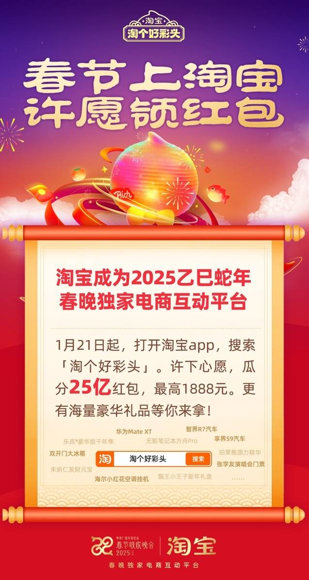 还有10天就是除夕,蛇年春晚也逐渐揭开其神秘面纱。今日获悉,淘宝成为2025蛇年春晚独家电商互动平台。而就在刚刚,淘宝官宣了春节互动玩法:许愿领红包,瓜分25亿。