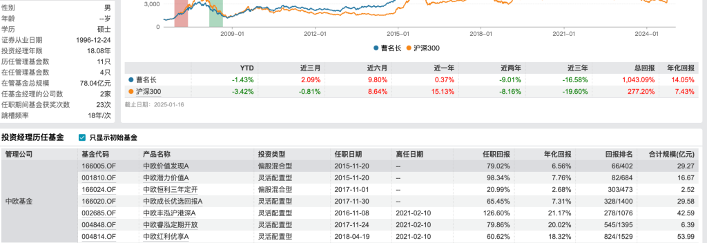 从业绩表现来看,截至1月16日,曹名长的年化回报率为14.05%。其中,他担任基金经理长达9.17年的中欧潜力价值A和中欧价值发现A,任职回报分别为98.34%和79.02%;中欧恒利三年定开、中欧成长优选回报在其任职的7年多时间里,任职回报则依次为20.99%、65.45%。