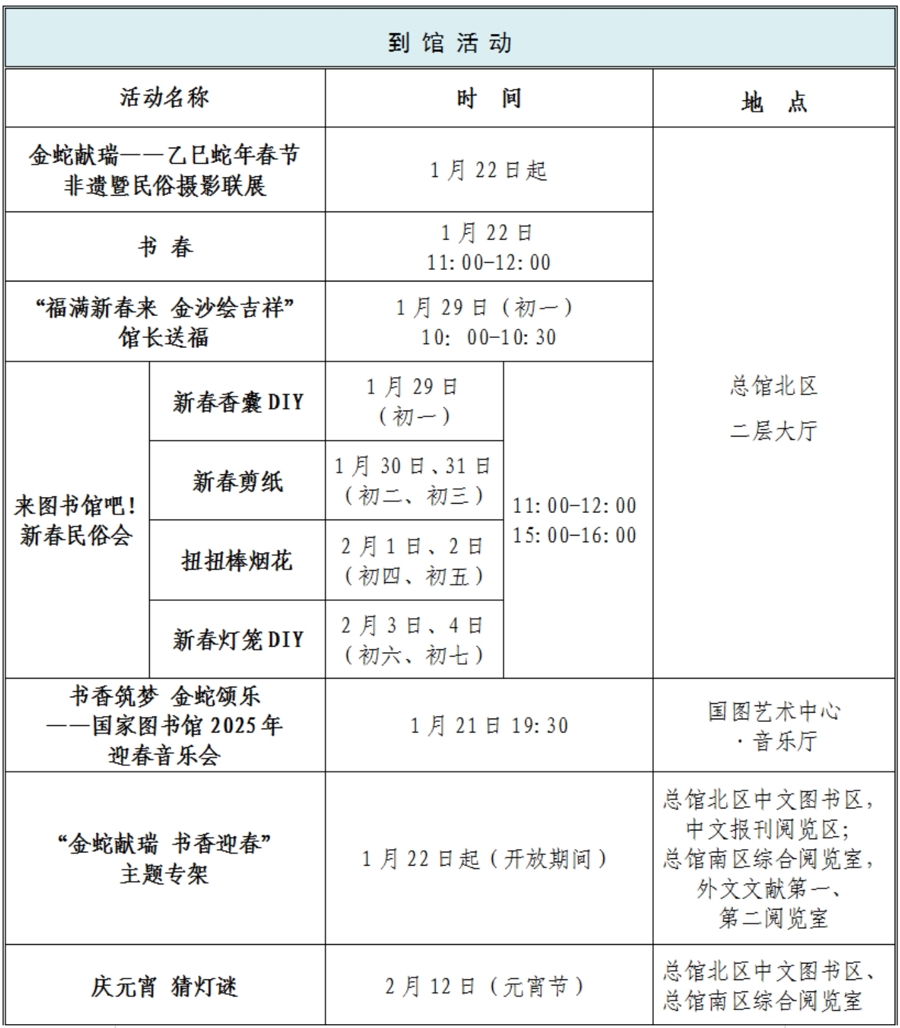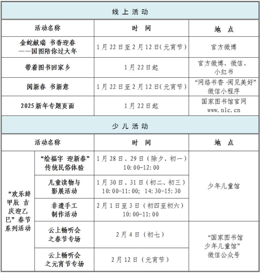 1月22日至2月12日,“金蛇献瑞 书香迎春——国图陪你过大年”读者互动活动,与全国各地图书馆联动,全面展示春节非遗文化和传统年俗。1月22日起,国家图书馆官方微博、微信、小红书等平台将推出“带着图书回家乡”馆员荐书活动,来自各地的馆员通过图书来介绍自己的家乡,分享家乡的历史、民俗和文化,欢迎读者线上留言互动。