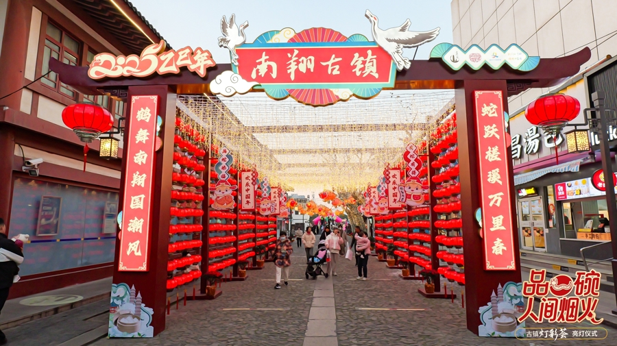 1月17日,夜幕降临,夜色中的南翔古镇一片流光溢彩。当天下午,“品一碗人间烟火·古镇灯彩荟”亮灯仪式在南翔古镇檀园举行,给即将到来的春节带来祥和喜庆的节日气氛。