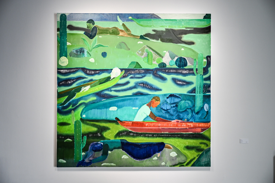 此刻,离他最近的作品,是他的代表作《愚人河》。画作笔触粗犷,色彩层次分明,借巧妙色调搭配与小船点缀,营造出和谐且充满张力的视觉效果。“画中人物于‘愚人河’的活动,象征着突破常规、探索未知的精神。”汪一借此深入探讨人与自然、内心宁静与孤独、生命旅程与未知探索等主题。