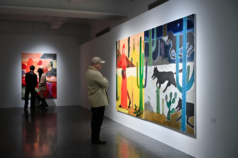 “小红帽”是“童话系列”的关键分支,创作于2019—2023年。此阶段汪一转向内心世界,将童话元素与个人情感、社会现实融合。《追逐》的画面奇幻神秘,小红帽身着红袍、头戴红兜帽,手提篮子,笑对夜色中的狼,似与之展开“追逐”游戏。汪一说:“小红帽的故事,或许未必如传统结尾呈现的那样令人愉快。当我们把它放在开放式结局时,会变得很复杂。”