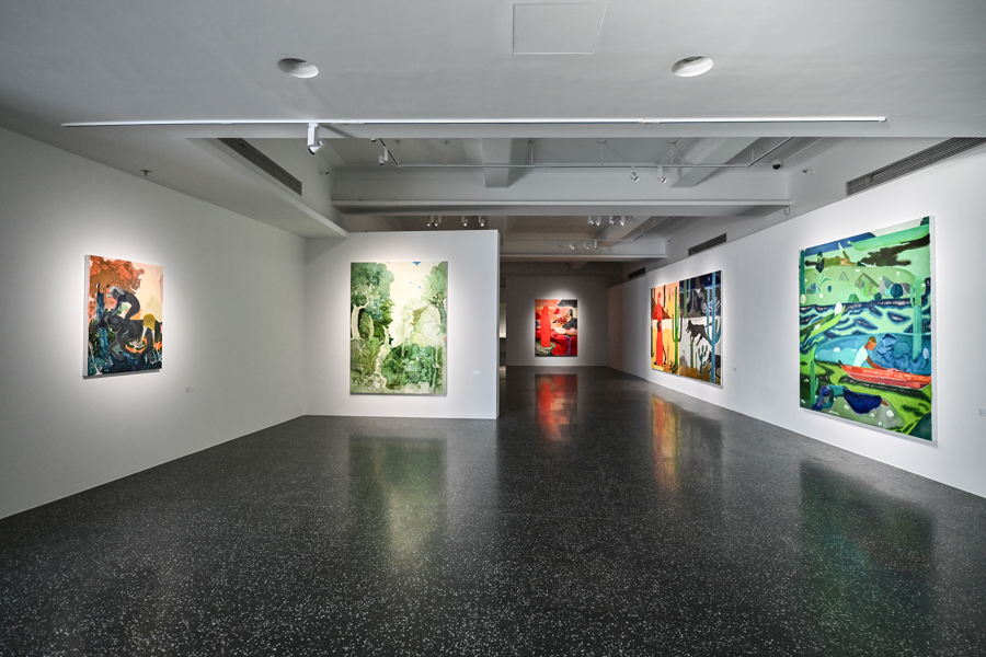 “岛屿”画展中,汪一展出了12幅布面油画作品,6幅来自“河流与船”系列,6幅来自“小红帽”系列。乍一看,这些作品显得截然不同,红色、绿色和灰色调,风景、叙事和寓言,但它们都传递着相同的信息。有些画作包含了危险信号,来自自然或人为的威胁,但画中的人物从未对这种威胁性环境流露出丝毫情绪。他们似乎在说:“别担心,生活只是一幅画”。