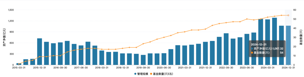 此外,自2023年下半年开始,兴银基金的资产净值迎来了增长高峰,并于2024年6月末达到1284.76亿元的规模峰值。Wind数据显示,截至2024年12月31日,兴银基金在管基金数量共54只,旗下基金资产净值合计为1067.32亿元,全行业排名57/202,其中债券型基金规模为646.82亿元,占比高达60.60%。