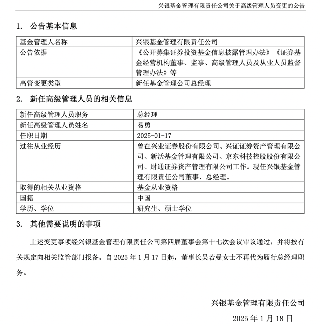 1月18日,兴银基金发布公告称,自2025年1月17日起,易勇新任公司总经理,董事长吴若曼不再代为履行总经理职务。