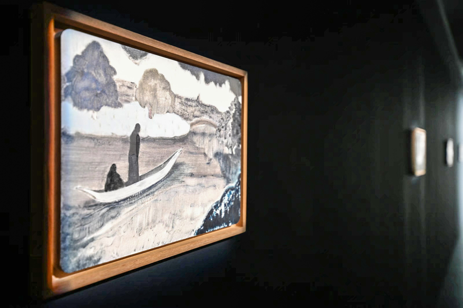 汪一的作品在色彩运用与线条勾勒方面展现出独树一帜的风格。他在创作中大胆地采用明快且对比强烈的色彩和灵动多变的线条。创作基本分为“童话系列”与“自然景观系列”。本次展览聚焦这两大系列的分支——“河流与船”及“小红帽”系列。“河流与船”灵感源自巴西作家若昂・吉马朗埃斯・罗萨的《河的第三条岸》。展览起始处的《聚会》系列是首次公开展出,《聚会》由10幅小尺幅木板蜡画组成,在幽暗的展厅里,灯光下的小作品就像一叶叶在黑暗的海上漂泊的小舟。汪一说,卡拉瓦乔的《水仙》对他来说是一幅很重要的作品。《聚会》系列中的一幅画就是引用了《水仙》的构图,与《水仙》不同的是,汪一画面上的人物在船上,而不是在池畔,凝视着水中自己的倒影,“如果我们试图在同一时刻将专注的自我和倒影结合在一起,那两者都会被摧毁。你可以看,但不能碰。”汪一这样解释。
