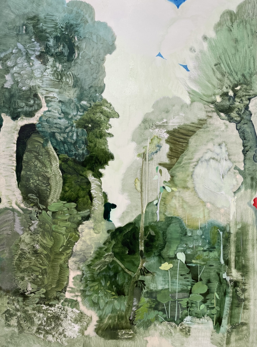 将自然景物与内心世界融合在一起,营造出一种既真实又抽象、既轻松愉悦又超凡脱俗,既描绘美好又蕴含抗争的独特氛围,这是汪一的艺术语言。乍一看,这些作品显得截然不同,红色、绿色和灰色调,风景、叙事和寓言,但它们都传递着相同的信息。这不仅展现了其个人内心深处的非理性话语,更蕴含着创作过程中那些细腻而独特的个人内在体验。