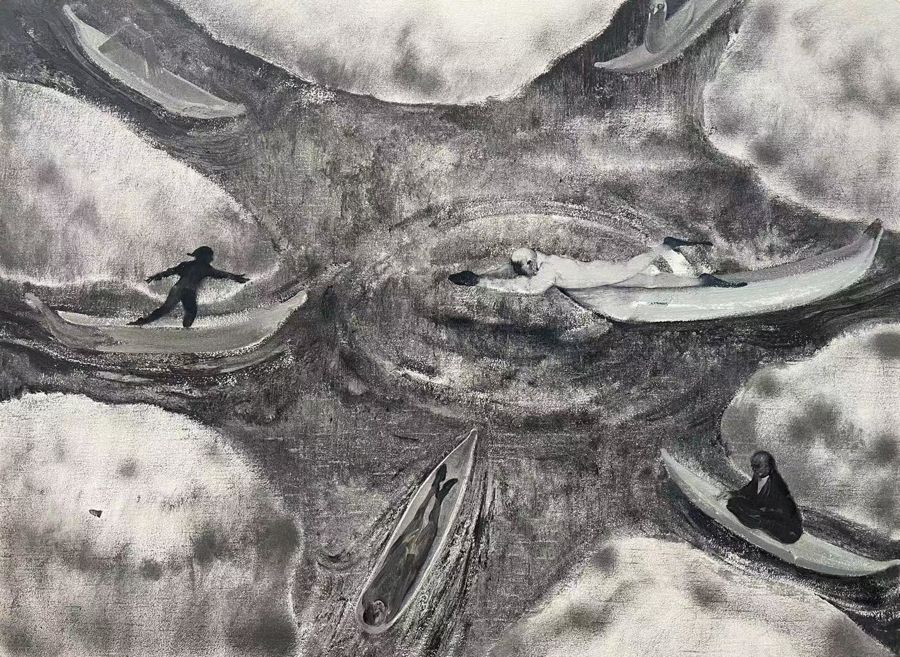其代表作《愚人河》笔触粗犷,色彩层次分明,借巧妙色调搭配与小船点缀,营造出和谐且充满张力的视觉效果。“愚人”寓意着对未知的无畏与陈旧观念的挑战,画中人物“愚人河”的活动,象征着突破常规、探索未知的精神。