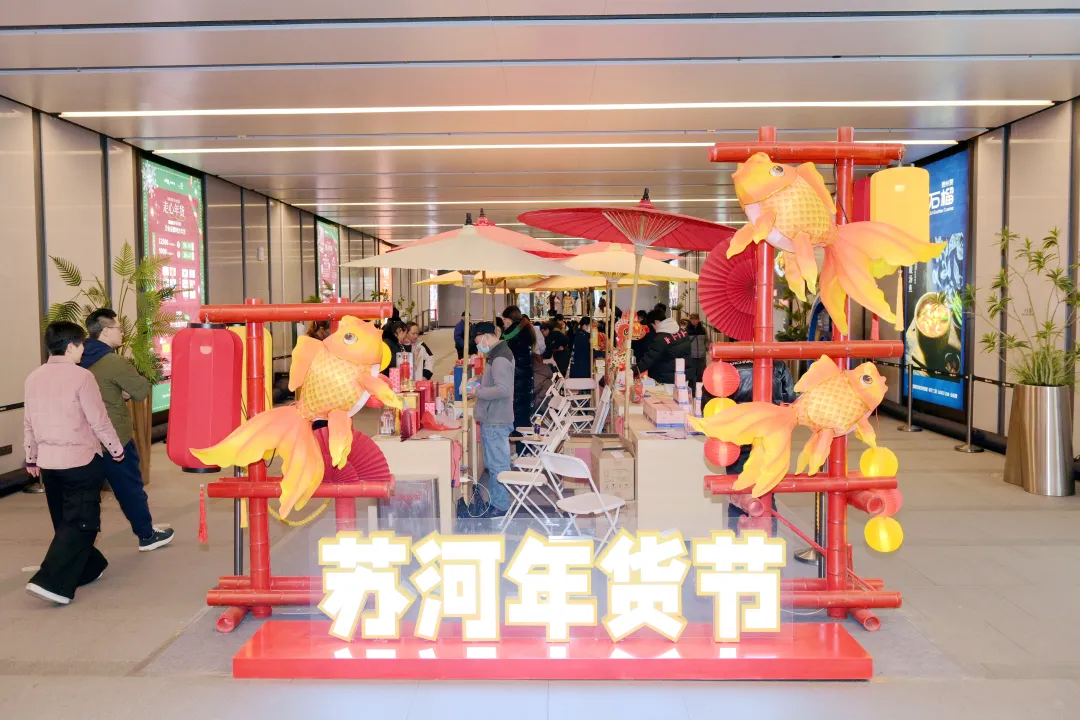 在苏河湾商圈的上海苏河湾万象天地,“苏河年货节”于同一天启动。在金黄鱼灯与大红灯笼的装点下,传统文化与现代活力交相辉映,点燃新年烟火气。