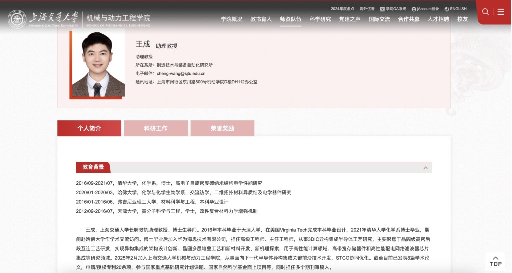 上海交大机械与动力工程学院官网显示,王成将任该院助理教授、博士生导师。 官网截图