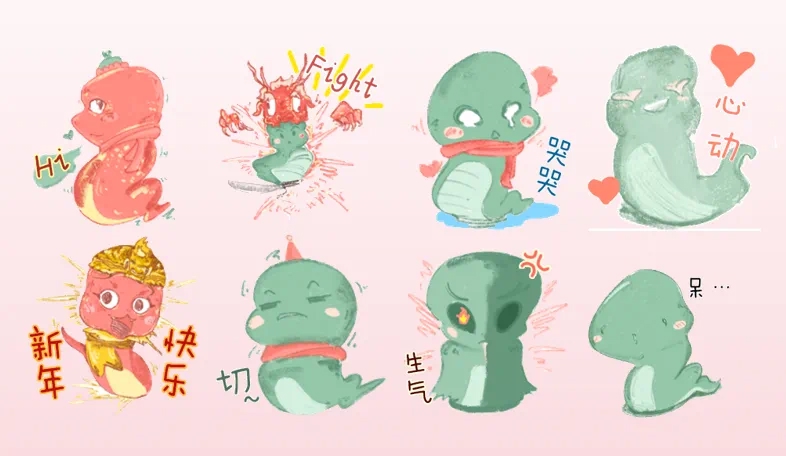此次展览,展厅门口的策展人展示墙、设计组的蛇年生肖表情包、壁纸,以及展厅内的青蛇、白蛇丝网造型装置都是这支策展团队的创意成果。
