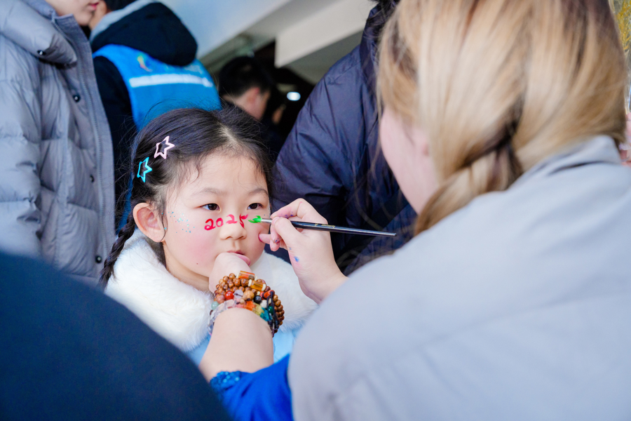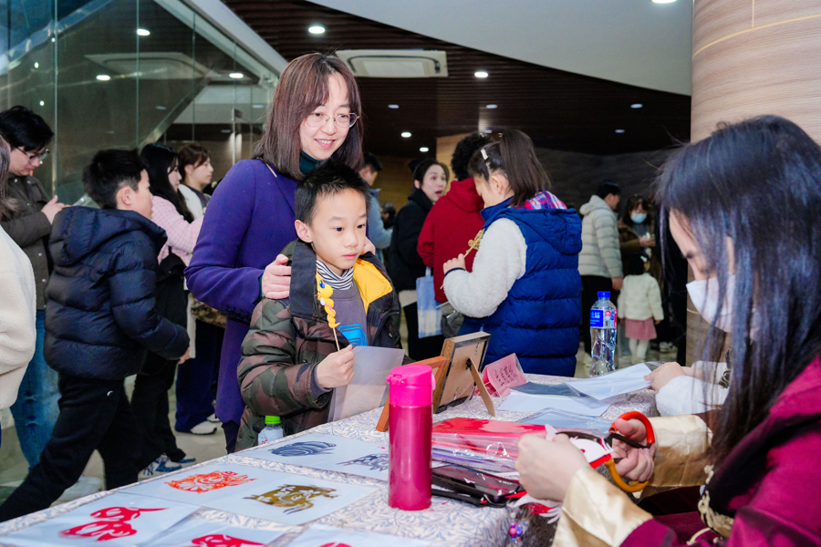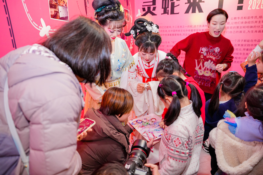 在蛇年生肖版画体验区,孩子们在专业版画家的指导下,亲手制作属于自己的蛇年生肖版画,感受传统版画艺术的魅力;在沉浸式越剧“白蛇传”互动中,观众和穿上精美越剧服饰的演员互动,体验剧中人物的情感与动作;在百衲布艺非遗体验区,非遗传承人现场教授百衲布艺的制作技巧,让观众亲手触摸到非遗的温度;皮影戏表演区,艺人们通过灵活的手指操控皮影角色,演绎出一个个生动的故事;长耳兔生肖绘本故事会区,孩子们围坐在一起,聆听绘本故事中的生肖故事。