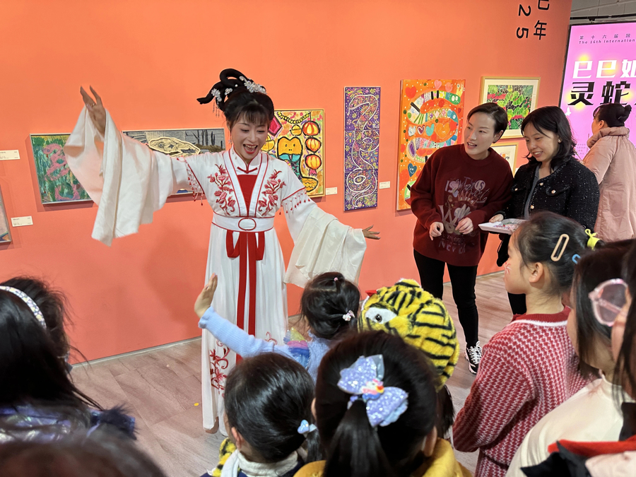 生肖主题美育集市同步举办。在蛇年生肖版画体验区,孩子们在专业版画家的指导下,动手制作属于自己的蛇年生肖版画,感受传统版画魅力。在沉浸式越剧《白蛇传》中,观众和演员互动,体验剧中人物的情感与动作。在百衲布艺非遗体验区,非遗传承人现场教授百衲布艺的制作技巧,让观众触摸到非遗的温度……