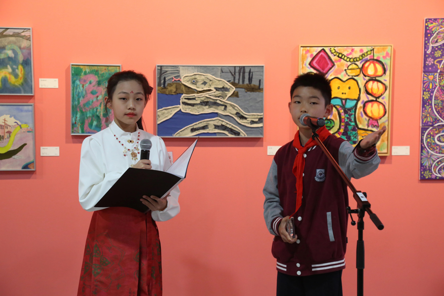 昨天,在上海虹桥当代艺术馆举办的“巳巳如意,灵蛇来了!——第十六届国际少儿生肖绘画作品展”开幕式上发言的是来自建青学校的“小小策展人”黄孟泽。展览不仅展出了数百件由孩子创作的以生肖“蛇”为主题的艺术作品,近30名策展人还都是孩子。
