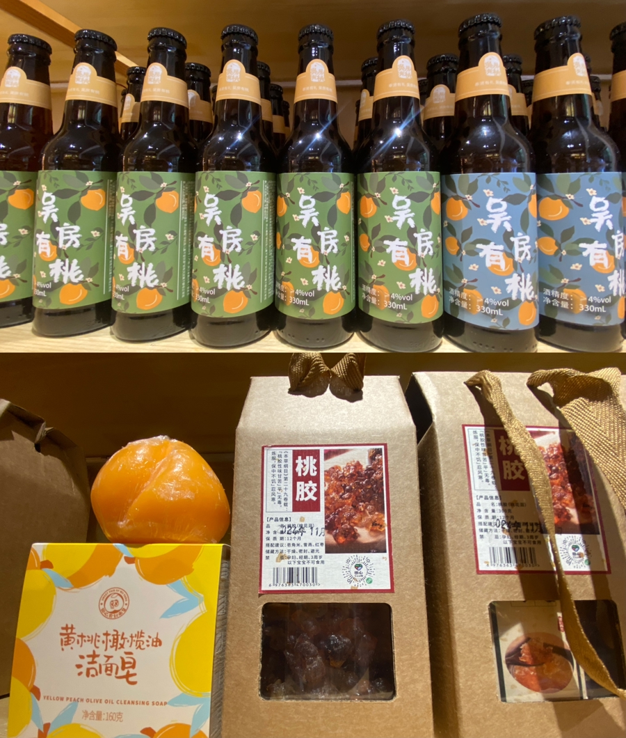 吴丹红把我带到村里的文创商店“田心农创市集”,店里的“吴房有桃”系列产品摆在C位,桃胶、桃酒、桃皂、桃汽水等,新潮而诱人。听说,支撑当地黄桃产业的是上海市农科院、江南大学食品研究中心等,目前已经成功创建了国家级现代农业黄桃产业园,还建起了自营电商交易平台。