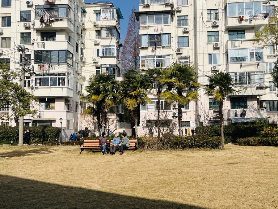 冬日暖阳下,居民在华院小区大草坪晒太阳。 长宁区供图