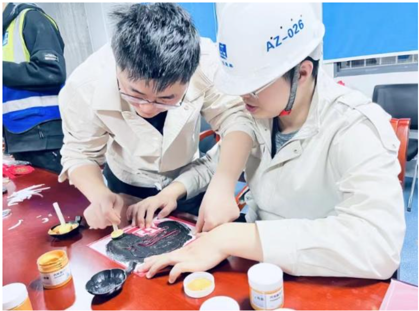 活动现场气氛热烈。项目负责人许永斌首先肯定了项目过去一年的工作成绩,对员工们的努力表示感谢,并预祝大家新春快乐、阖家幸福。随后,在项目工会主席肖奇的主持下,员工们积极参与“梅影绘春”的绘画创作,以梅花为灵感源泉,挥洒笔墨;在“拓印迎福”环节,将传统文化与现代艺术相结合,制作出独具特色的拓印作品。此外,现场还组织了一场充满趣味性的猜字谜比赛,项目部为获胜者颁发了特别定制的纪念品。