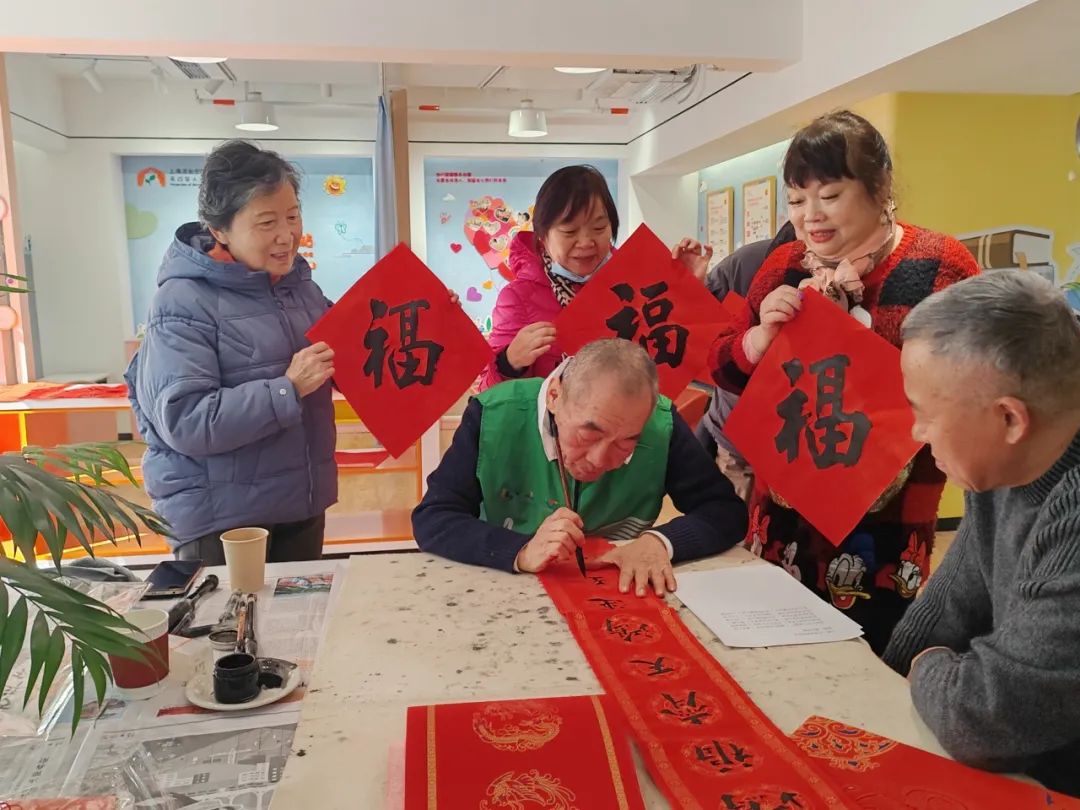 铺纸、蘸墨、下笔,墨香四溢的迎新现场,书法家们“挥毫泼墨”,写出数副喜气洋洋的“福”字和春联,吸引了众多居民前来围观。“大家在一起就像个大家庭,很有氛围,好像新春佳节已经到来了一样,很开心。”拿着“福气满满”的“福”字,居民吴阿姨笑得灿烂。