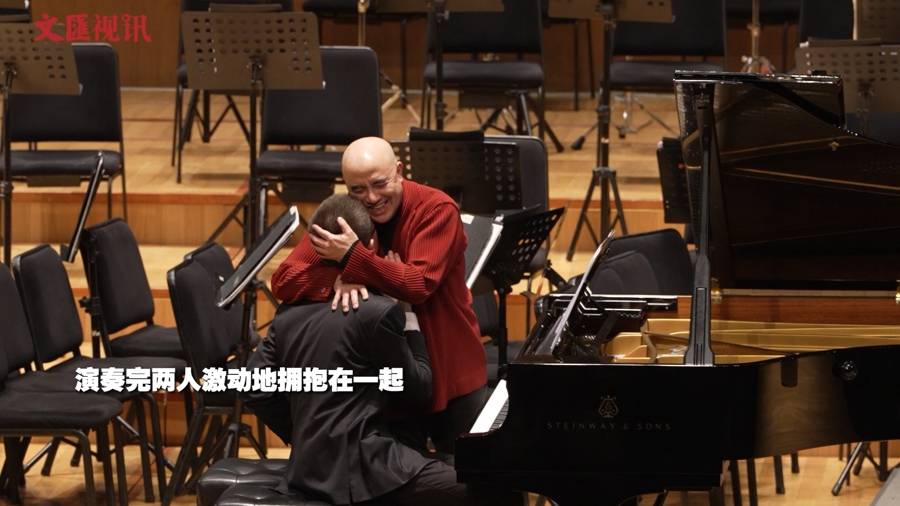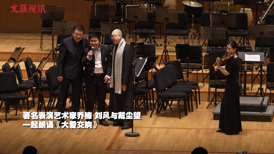 音乐会上,著名表演艺术家乔榛、刘风与戴尘望一起朗诵《大爱交响》。钢琴家孔祥东与10年前合作的陈正桐再度同台,演绎钢琴四手联弹《培尔金特第一组曲》,演奏完毕两人激动地拥抱在一起。