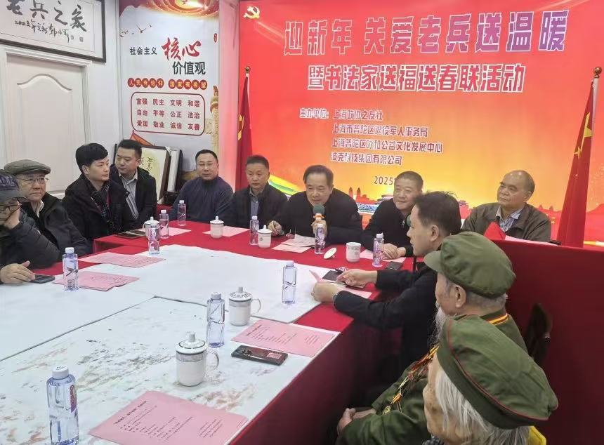 在春节即将到来之际,普陀区退役军人事务局、上海政协之友社、普陀区咏和公益文化发展中心(以下简称普陀区咏和公益中心)、波克科技集团有限公司,在位于普陀区桃浦路1613号的退役老兵红色记忆馆,主办了一场别开生面的“迎新年、关爱老兵送温暖暨书法家送福、送春联活动”。来自上海警备区和武警上海市总队的老将军、抗美援朝和援越的老军人、书画家等参加。