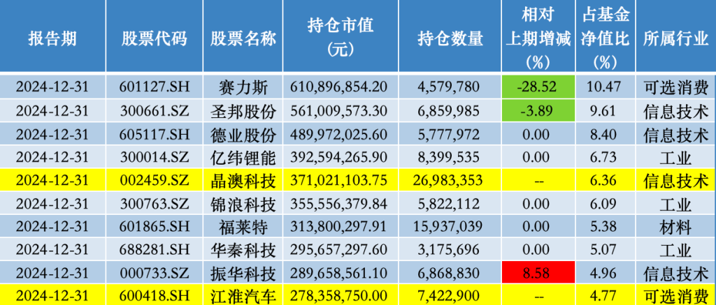 具体来看,2024年四季报显示,广发小盘成长混合的前十大重仓股依次为赛力斯(601127.SH)、圣邦股份(300661.SZ)、德业股份(605117.SH)、亿纬锂能(300014.SZ)、晶澳科技(002459.SZ)、锦浪科技(300763.SZ)、福莱特(601865.SH)、华秦科技(688281.SH)、振华科技(000733.SZ)、江淮汽车(600418.SH)。