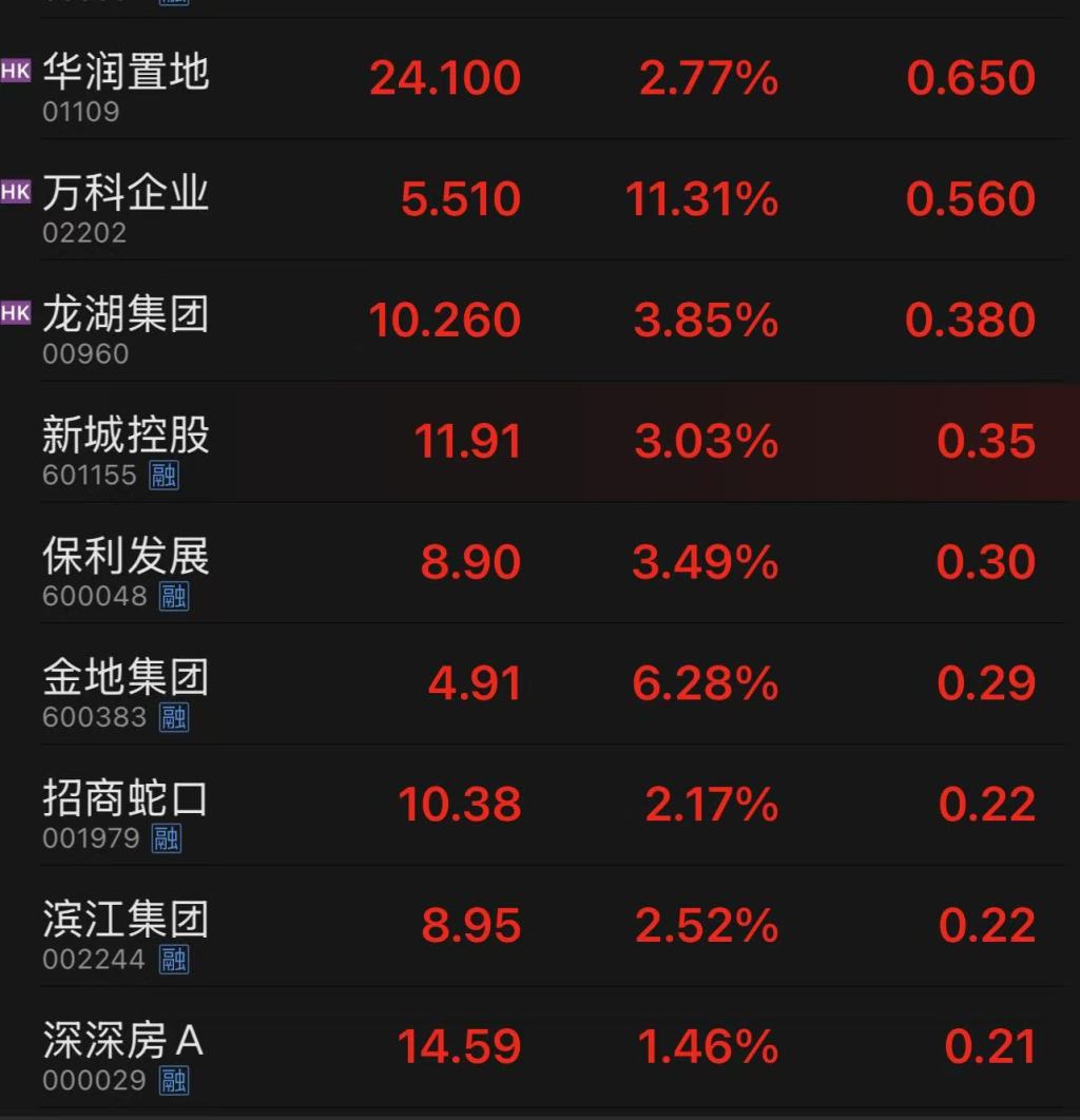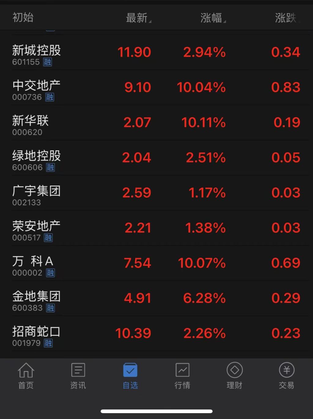 从A股来看,截至发稿时,万科A(000002.SZ)涨停,报7.54元/股;中交地产(000736.SZ)报9.1元/股,涨停10.04%;新华联(000620.SZ)报2.07元/股,报10.11%。