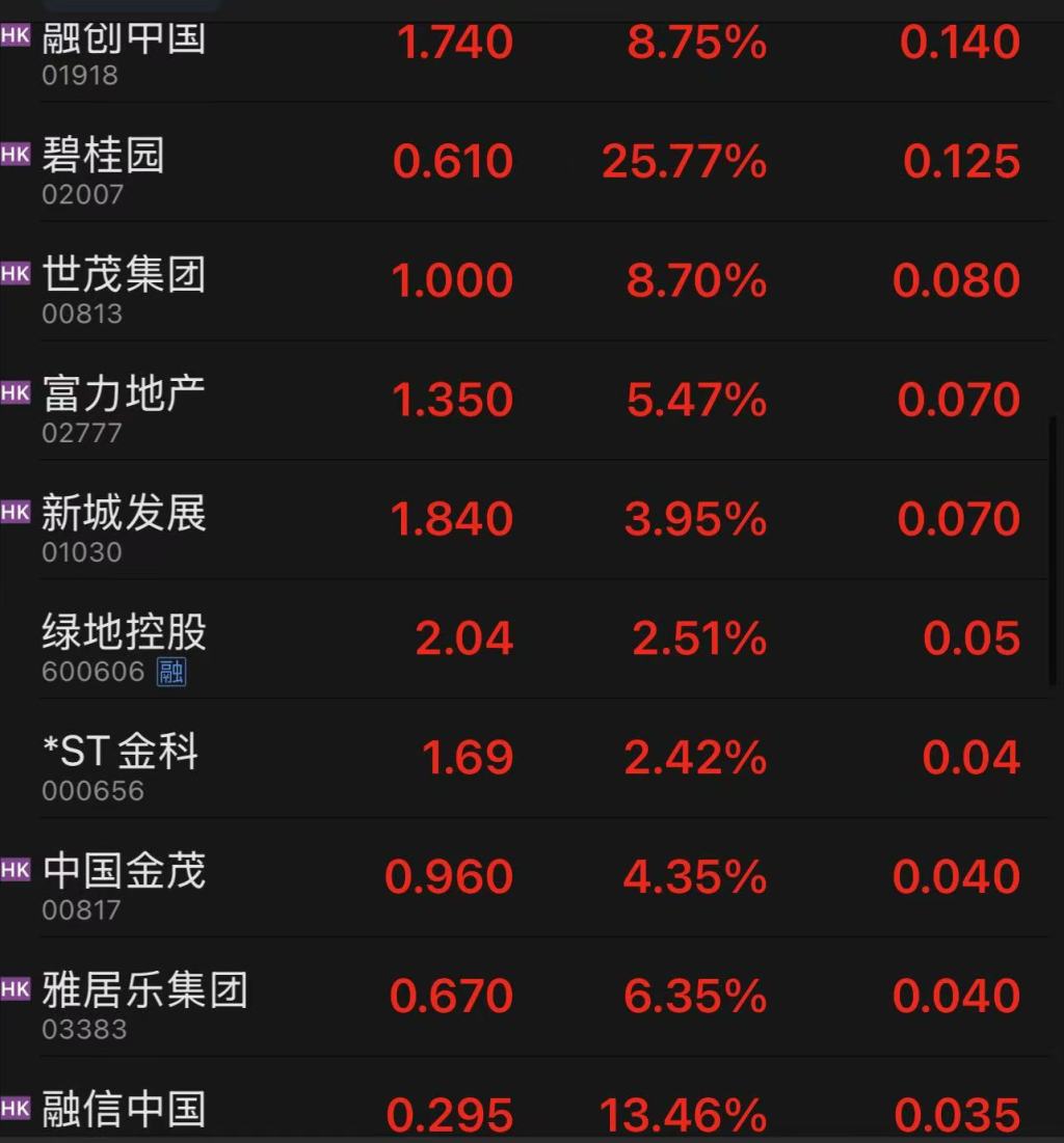 港股方面,今日复牌的碧桂园(02007.HK)报0.61港元/股,涨幅25.77%;融信中国(03301.HK)报0.31港元/股,涨幅19.23%;万科企业(02202.HK)报5.6港元/股,涨幅13.13%;中梁控股(02772.HK)报0.124港元/股,涨幅20.39%;融创中国(01918.HK)报1.75港元/股,涨幅9.38%;旭辉控股集团(00884.HK)报0.285港元/股,涨幅5.56%。
